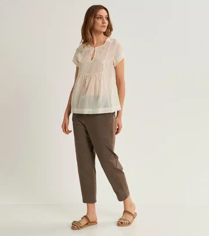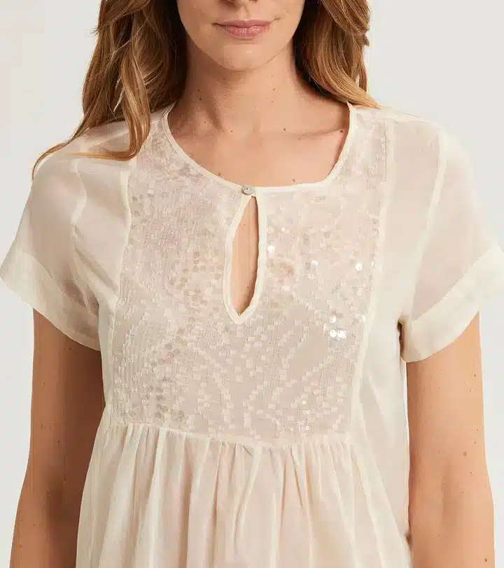 Scegli la blusa realizzata in cotone dalla texture impalpabile con paillettes ricamate sul davanti. Chic e sofisticato, il modello ha collo a giro con goccia e maniche corte.