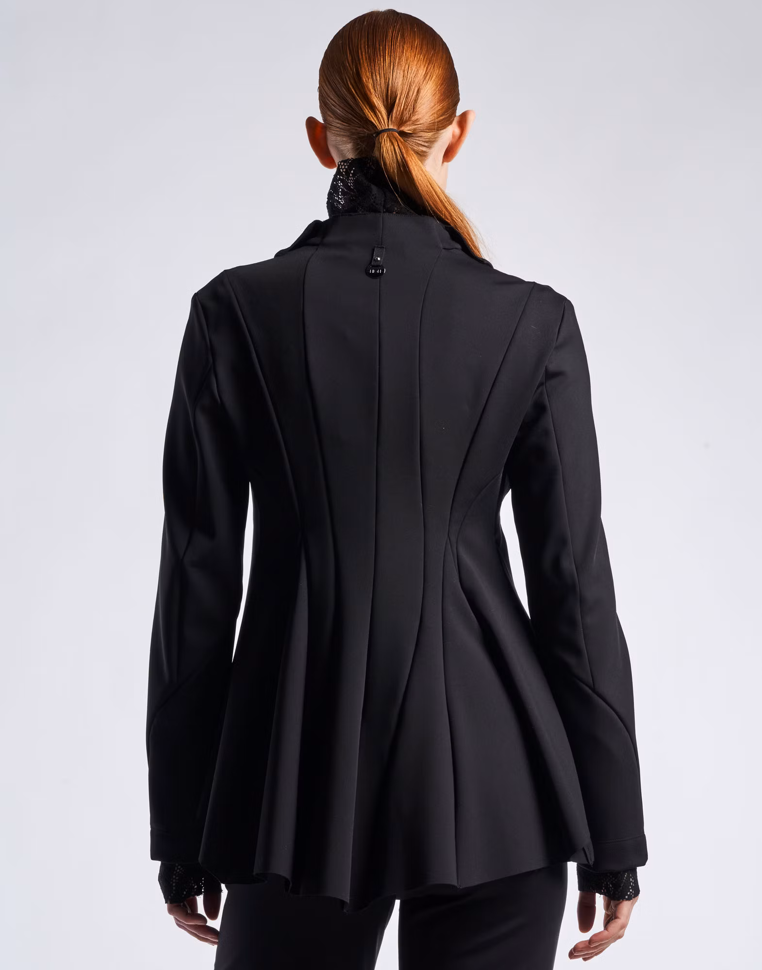 Giacca sartoriale destrutturata in morbidissimo jersey di neoprene sportivo nero. Revers classico e chiusura frontale con bottoni a pressione gommati. La linea sul busto è creata da molteplici cuciture curvilinee che partono dalle spalle e si allargano sull’orlo con inserti a godet. Spalle naturali e maniche con cuciture a spirale, polsini dritti. Costruzione sul retro con pannelli e cuciture curve multiple che si allargano sul fondo creando un orlo drappeggiato a coda. Orlo drappeggiato frontale, più lungo sul retro.