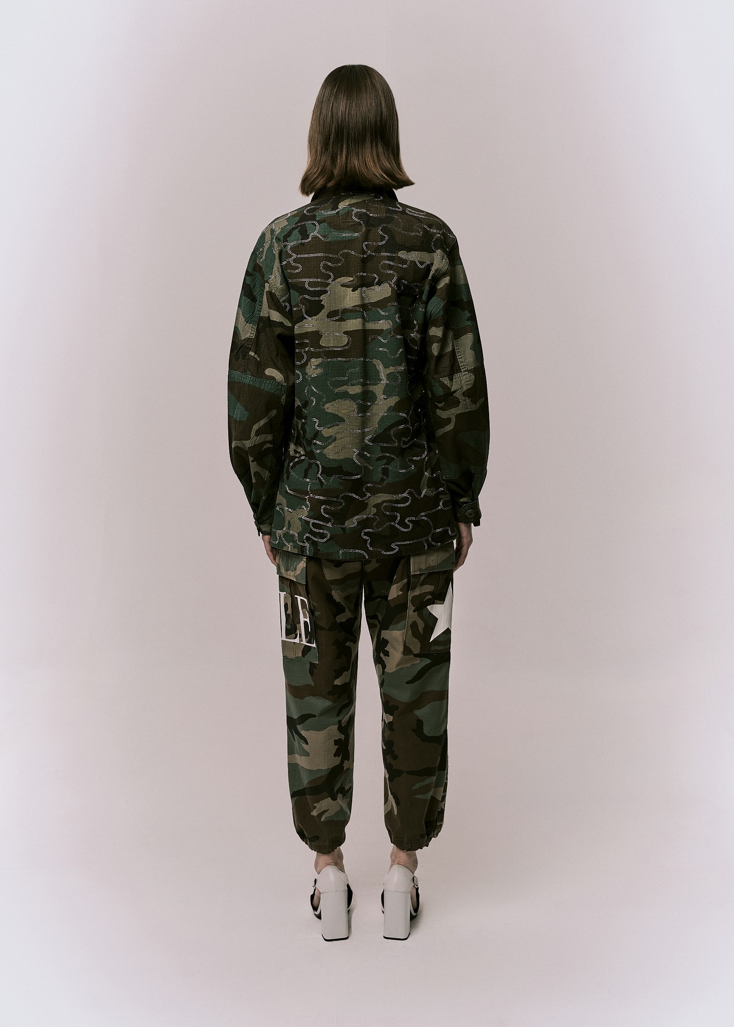 PANTALONI CAMOUFLAGE VINTAGE SCRITTE FAKE CON DAVANTI APPLICAZIONI STRASS NEI TESSUTI VINTAGE QUINDI UNO DIVERSO DALL’ALTRO IN LIMITED EDITION