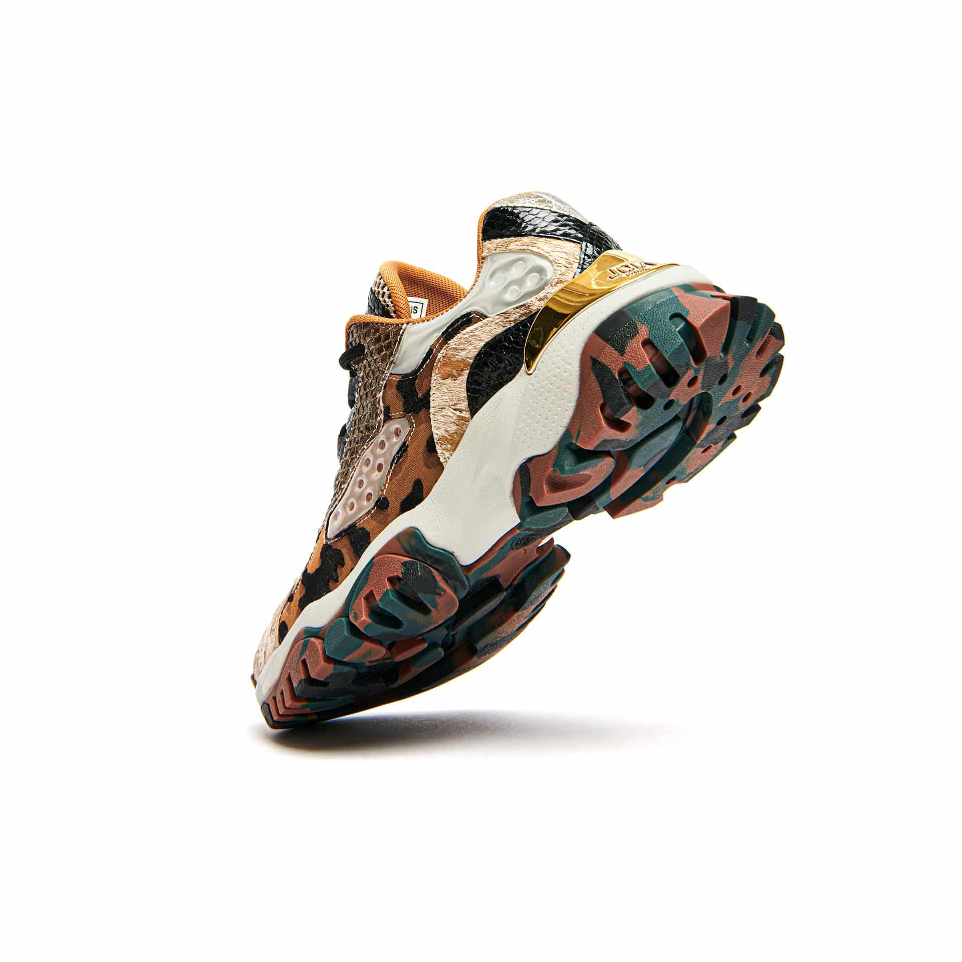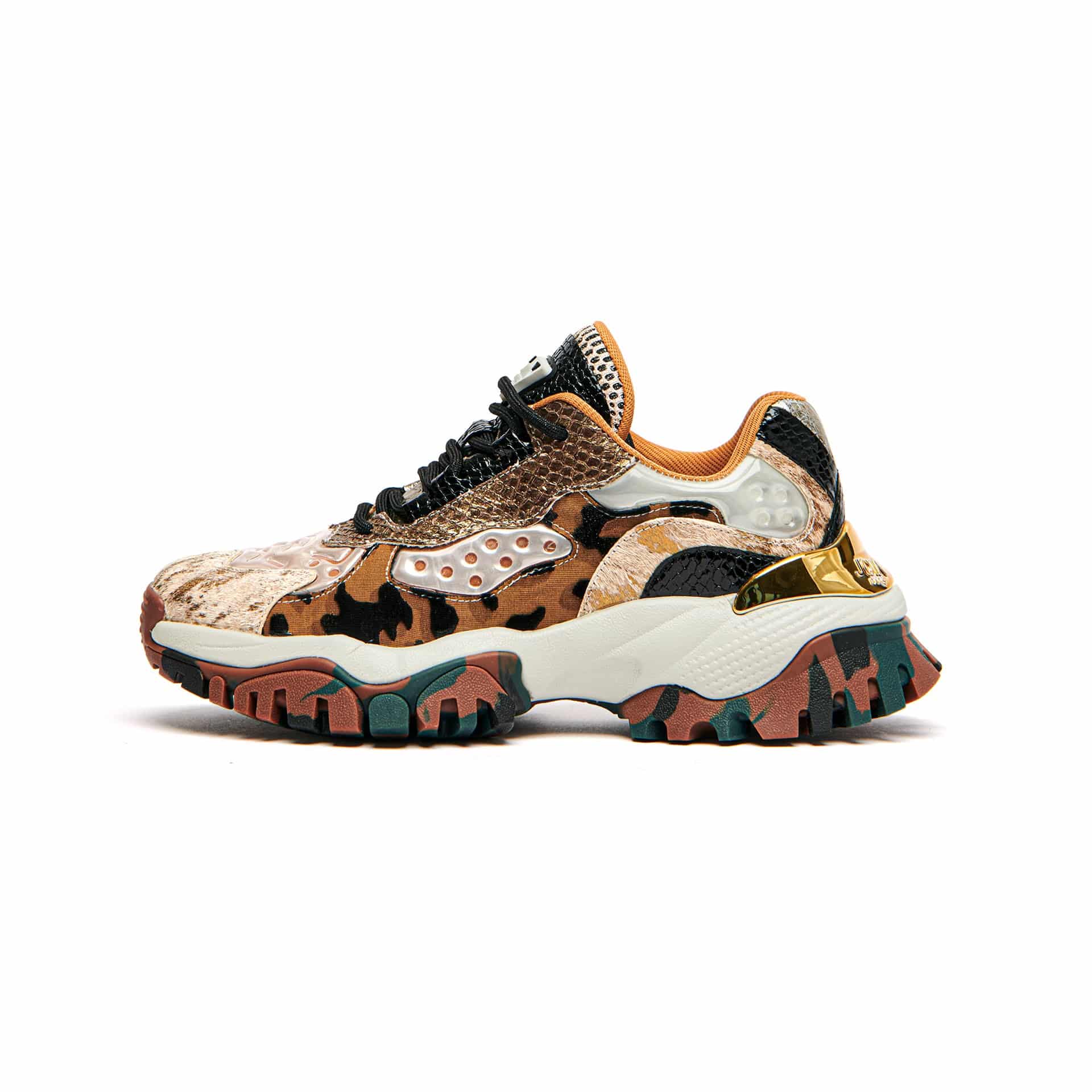 Sneaker multimateriale pelle stampata, cavallino e tessuto con rete, accessorio in pvc . Fodera tessuto. Suola in gomma outdoor con inserto effetto metallico posteriore. Altezza suola 30. Plantare estraibile.